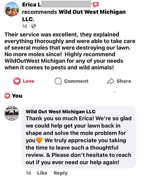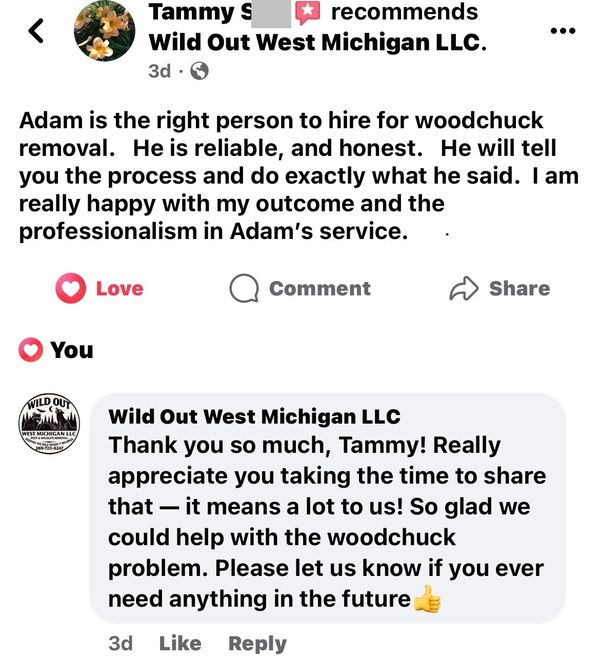 At Wild Out West Michigan LLC, we're a local, family-owned business that prides itself on being honest, dependable, and knowledgeable. We understand the worry that comes when wildlife shows up where it doesn't belong, and we're here to provide straightforward and professional solutions. From bats in attics, skunks under decks, raccoons in barns, woodchucks around foundations, or moles damaging lawns — we deliver wildlife removal and prevention services that protect your property and your peace of mind.