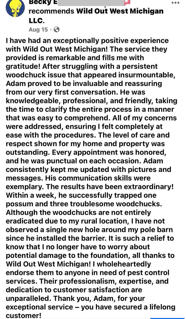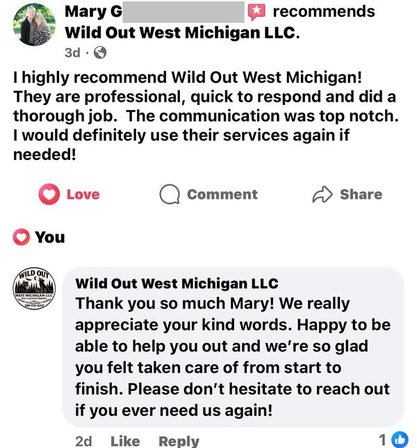 Wild Out West Michigan LLC is a husband-and-wife team serving our home community. Adam handles the fieldwork, Lindsey keeps operations running smoothly, and our golden retriever Lady May tags along as the “field boss.” We’re not a big franchise — just a local, family business that takes pride in being honest, dependable, and professional. When you call us, you’re talking directly with the owners who will show up, do the work themselves, and treat your property with the same care and respect we’d give our own. And because we truly care about the people we serve, we’re committed to solving the problem the right way.
